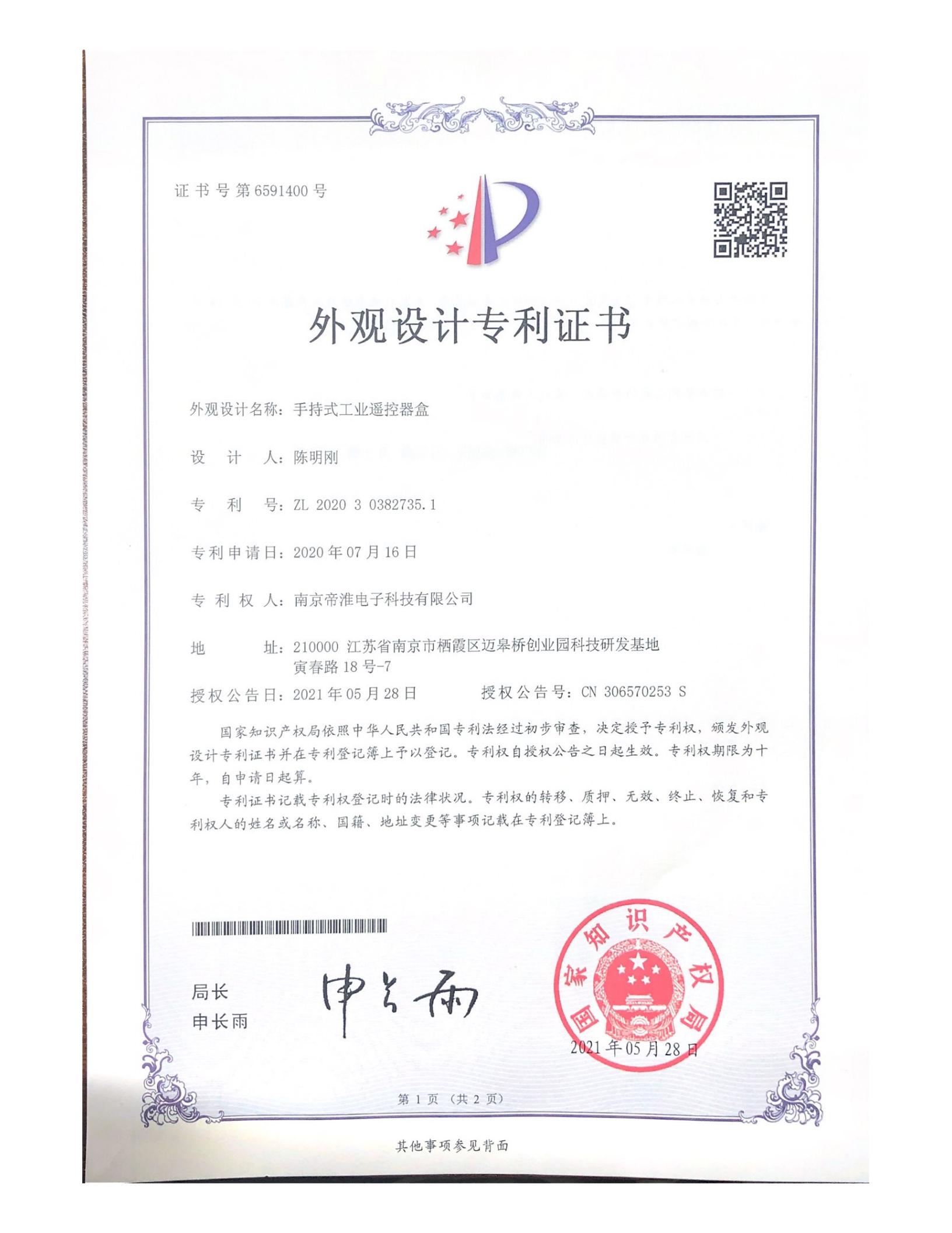 南京帝淮电子科技有限公司,国内工业遥控器行业领军企业,自主研发、定制、非标设计各类工业级无线遥控器、工业级有线控制器、智能化自主算法逻辑的本地控制器等系列产品。已经申请及正在申请的技术专利、外观专利有近三十项左右,并通过了CE欧盟认证、国家级试验检验报告、EMC电磁兼容认证等。